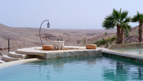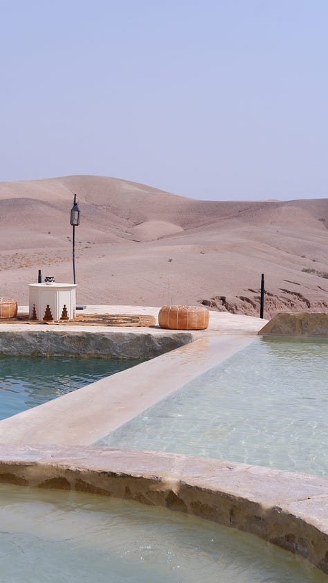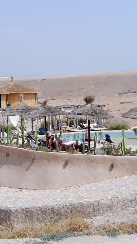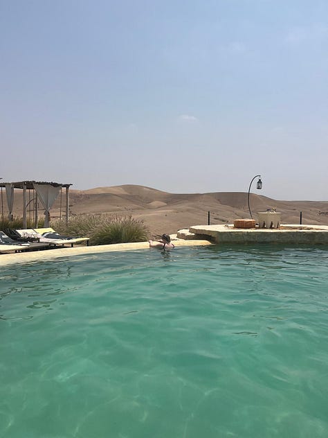 After thinking that Marrakech couldn’t possibly get any better, Be Agafay really delivered, totally making up for our cancelled plans. Once the clouds had shifted and we’d picked our spot next to THE most insane pool I’ve ever seen, we were met with views of desert for miles, with camels and dune buggies just specks in the distance.